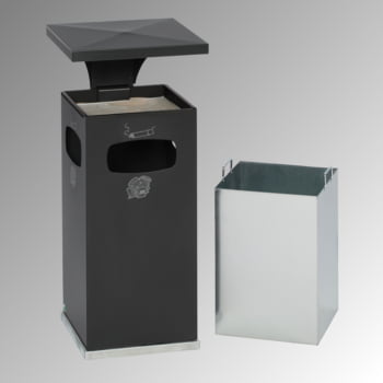 Hochwertig verarbeiteter Mülleimer für den Außenbereich. Das Dach verhindert übermäßiges Eindringen von Regenwasser und dient als Diebstahlsicherung für den Aschereinsatz.