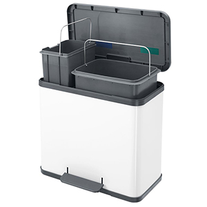 ∙ Rechteck-Gehäuse mit einzelnen Inneneimern zur Mülltrennung ∙ Stabil und standfest ∙ Deckel aus hochwertigem Kunststoff in schwarz mit Vertiefung zur Kennzeichnung der Abfallsortierung, inkl. Aufkleberset · Gedämpfter Deckel-Schließ-Mechanismus - Deckel schließt leise · Großer Öffnungswinkel zum leichten Befüllen · Ergonomischer Tragegriff im Deckelscharnier integriert · Ergonomisch breites Fußpedal · Innenliegende, hygienische Tretmechanik · Standfest durch breiten Bodenring