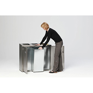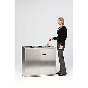 · Gefertigt aus Edelstahlteilen · 3 Einwurföffnungen mit farbigen Ringen aus verzinktem und pulverbeschichteten Stahlblech zur Wertstofftrennung, Farbe grau für Restmüll, blau für Papier, gelb für Wertstoffe · 4 verstellbare Füße für Niveauausgleich · Verschließbare Doppelflügeltür mit Doppelbartschloss und Griffmulden · 3 Inneneinsätze aus Edelstahl mit Bügelgriffen und einem Volumen von je ca. 90 Liter