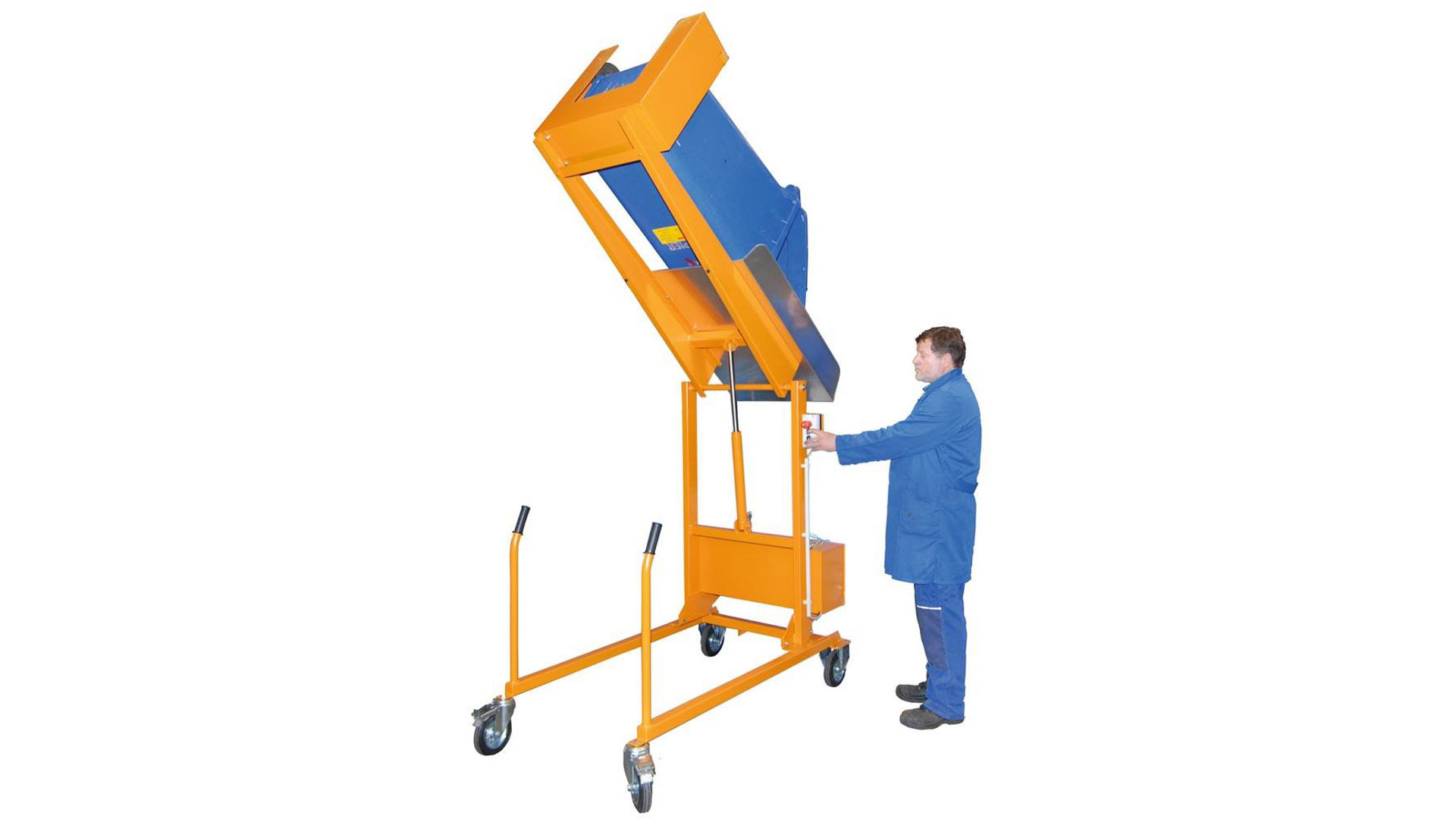 Station zum Entleeren und Reinigen von 120- und 240 l Mülltonnen. Mit der Kippstation transportieren Sie Ihre Mülltonnen zum gewünschten Entleerungsort, z. B. einem Container. Je nach Ausführung lässt sich die Mülltonne elektrisch oder manuell kippen.