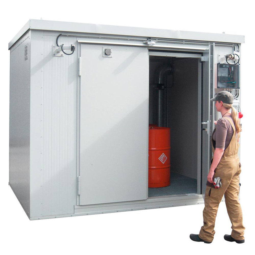 ∙ > 5-facher Luftwechsel mit automatischer Abluftüberwachung – signalakustisch & optisch am Container ∙ Potentialausgleichsschiene außen am Container∙ Abluftführung über Dach oder SeitenwandWeitere Größen und Ausführungen ∙ Breite 2000-8000 mm ∙ Tiefen 2000 und 3000 mm ∙ Höhen 2500 und 3000 mm ∙ Wahlweise Einflügel- oder Doppelflügeltür